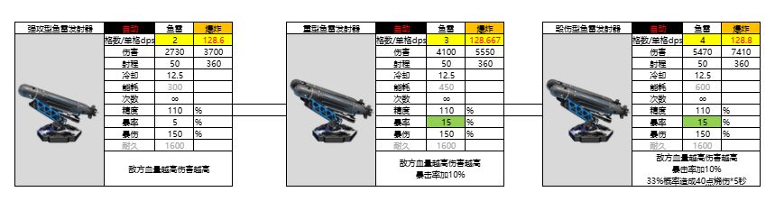 评价:加20%爆伤非常强大,一定要升到三阶。只要你的暴击率够高,那他将比前面介绍过的所有鱼雷伤害都高。