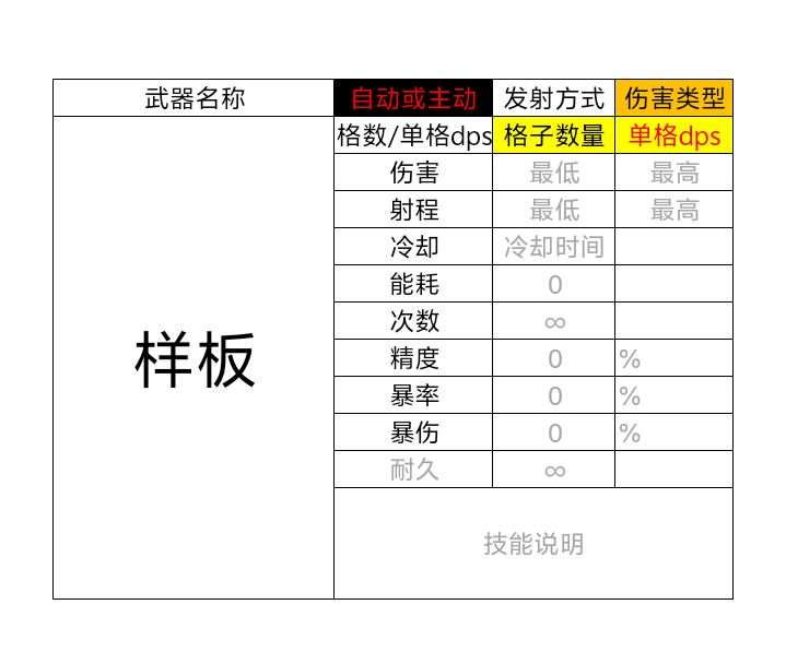 下图为表格的样板。最重要的就是右上角的单格dps那一项。除开技能,这个就是最能代表武器强度的直观体现。
