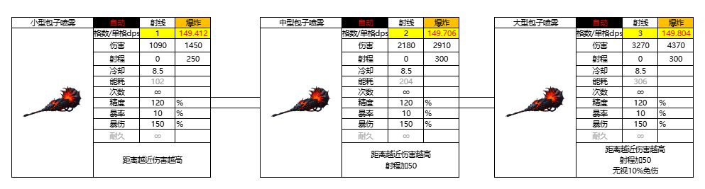 评价:秒伤高的离谱,代价就是不吃加成,拿上限换的。另外此武器的发射方式其实和射线类武器差不多,是一道火雾。无法被拦截。