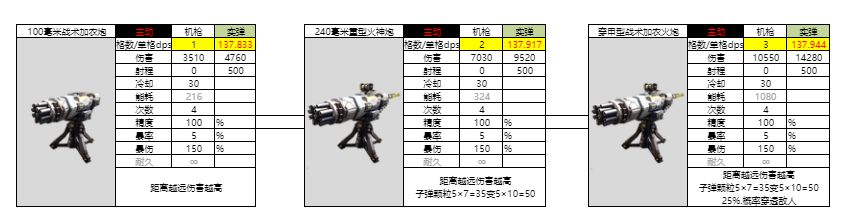 评价:这货是所有机枪武器里面秒伤最高的了,缺点也很明显。二阶以后冷却时间减了两秒,但是伤害也降下去了,所以每秒伤害并没有任何增加,只是单纯的cd减少。这使它更容易卡炮口,不能像别的武器一样装一大堆。其次这个距离越近伤害越高并不是额外算,而是包含在他的这个伤害浮动1490~1990里面。你直接贴到敌人脸上他就能达到极限1990,但是绝对不会超过这个数。贴脸约等于提升15%伤害