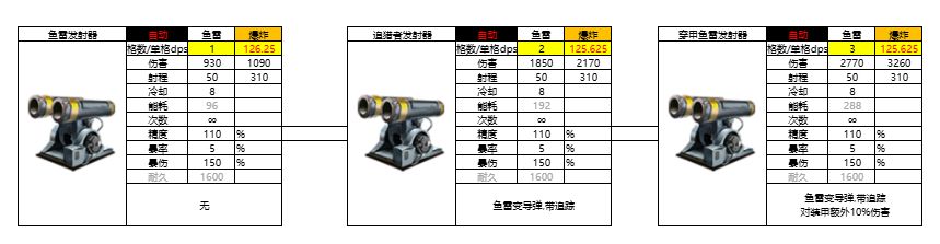 单格秒伤125。一阶无技能,二阶鱼雷变导弹,带追踪,三阶对装甲额外10%伤害