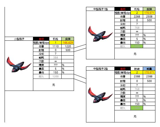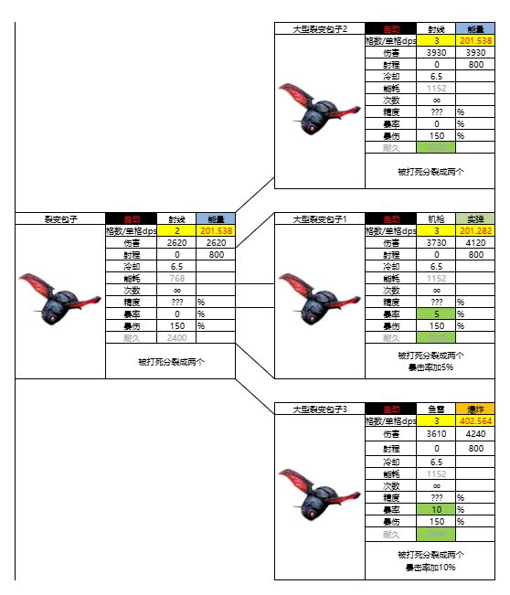 单格秒伤210。技能:被打死分裂成两个,二阶切换职业,可选能量射线0暴击率/实弹机枪5暴击率/爆炸鱼雷10暴击率