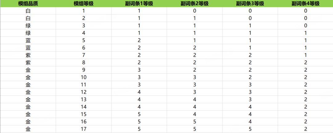 举例:拥有一个金品质模组,该模组4个副词条等级相加为17级,在更新后,激活对应模组为14级;若该模组最大等级为12级,则激活对应模组等级为12级。