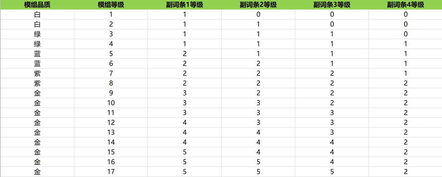 2)模组等级由其副词条等级加总构成,模组最高等级为17级。模组等级越高,副词条属性等级越高。模组等级将直接显示在模组图标上,方便玩家查看与操作。