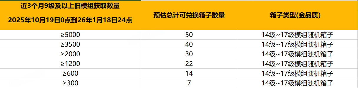 3、根据近3个月获取的等级≥9级金品质模组总量,补偿模组粉尘,可以进行新模组随机箱子兑换