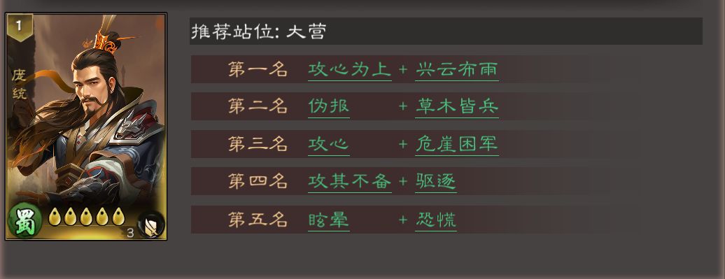 庞统是蜀阵营谋略队的核心武将,搭配控制或续航型武将能最大化其输出与功能价值,审时度势则可作为刚需洞察场景的备选提炼技能。