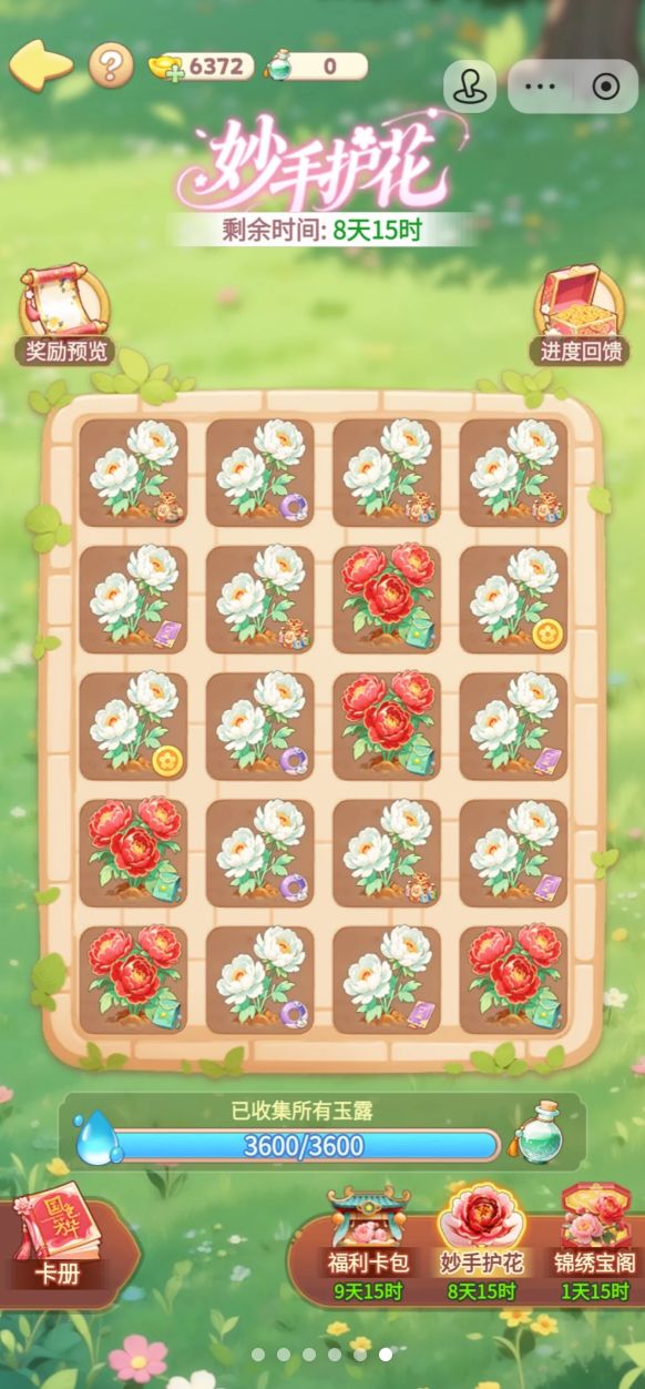 在花园消耗水滴 / 玉露就能参与妙手护花,上限 3600 滴,达标后能解锁 20 个红牡丹和白牡丹折子:红牡丹折子可兑换联动新卡,白牡丹折子能开出随机金币和实用道具,零氪玩家也能轻松参与。