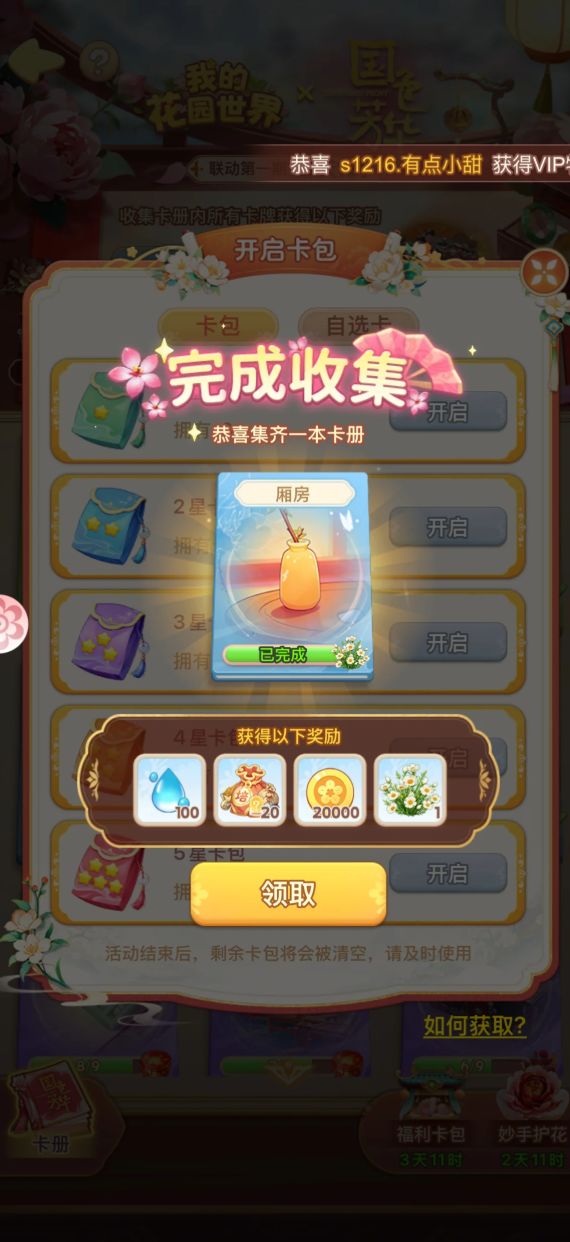 核心玩法:集卡兑奖 + 护花闯关,福利拿到手软1. 集卡册任务:解锁终极鲜花大奖联动的核心玩法之一就是集卡册,卡册共 15 页,越往后解锁难度越高,集齐全部卡牌就能拿下芳华寻蝶终极鲜花大奖!