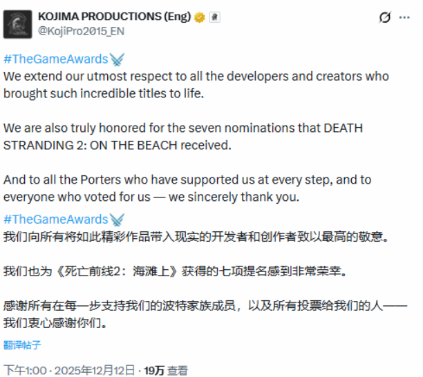 TGA 2025颁奖典礼落幕当晚,小岛秀夫领衔的小岛工作室通过官方社交媒体发布致谢声明,回顾新作《死亡搁浅 2:冥滩之上》的本届TGA征程,展现行业格局与对作品的自信。