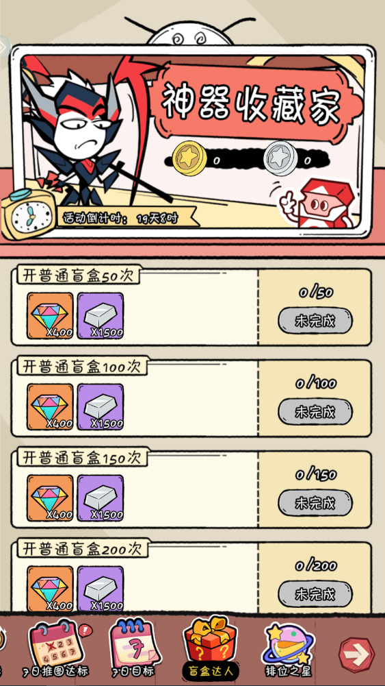 - 宝箱达人:奖励类似招募券变成砖石,参与活动建议把团购跟特卖礼包都买了,来获得材料,先从高价值的礼包买起,价值越高的礼包获得的东西越多,需注意活动有时效,开启七天后活动结束。