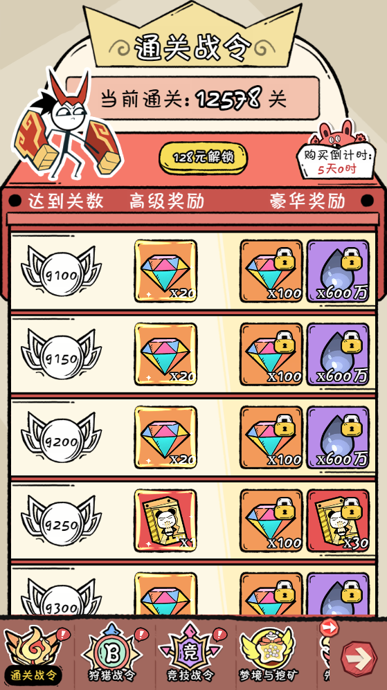 - 通关战令:30元解锁每通关50获得对应奖励活动大量砖石跟墨水,核心材料招募劵,最高领到1000关奖励。前期必购礼包(需注意战令购买有时效,七天后无法再购买这个礼包)。