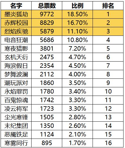 本期投票TOP3星铸宝箱【墨炎狐劫】【赤辉校园】【烈焰疾驰】将在下一期返场中上线,具体返场时间和信息我们将在后续公告中尽快公示!