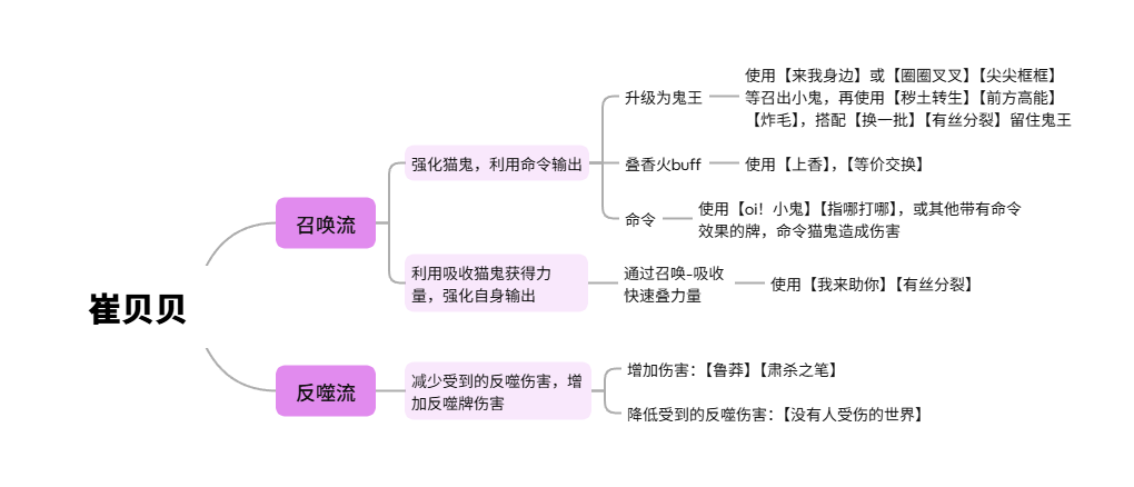 崔贝贝是来自地府的判官,其核心机制为“召唤”和“反噬”,因此诞生出两个流派:召唤流和反噬流。
