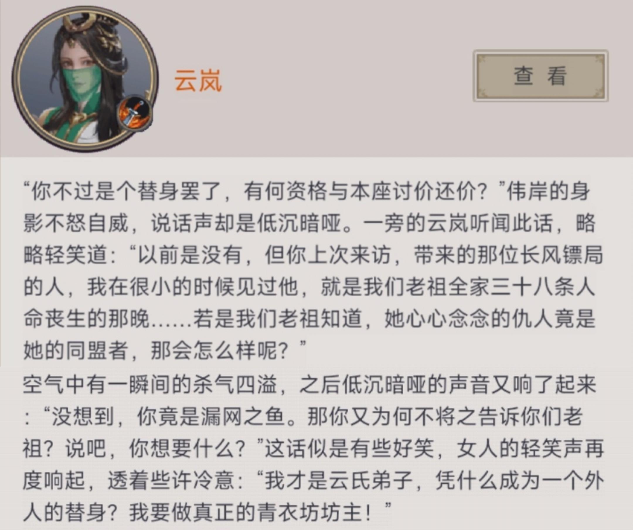 玩家多次拜访青衣坊主被拒见,无奈只能悄咪咪潜伏进去,奈何玩家潜伏技术太差,然后又一路打打打,期间遇见云嬷嬷了解了部分信息,最后打败云胭和青衣老祖,向老祖承诺查清云家灭门真相,两派争斗得以暂时停息。