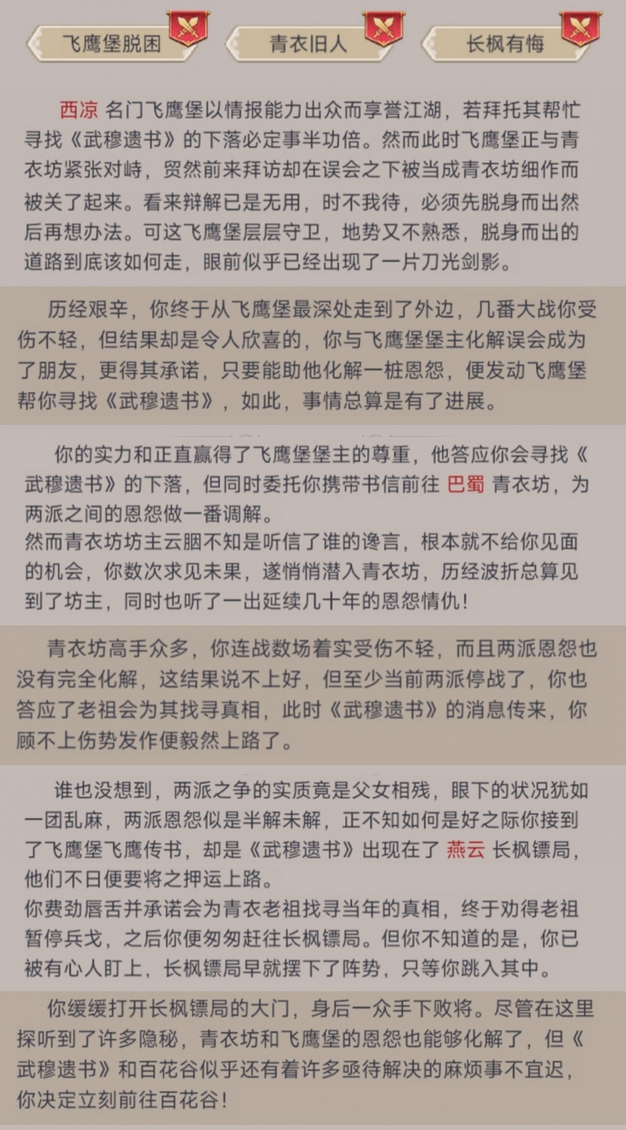 书接上回,武墓事了之后,由于《武墓遗书》被盗,玩家将前往江湖中情报能力出众的名门飞鹰堡寻求帮助,但由于飞鹰堡与青衣坊的紧张局势,玩家被误会成细作被抓了起来。随后玩家凭借强大的实力成功逃出并击败飞鹰堡堡主阎百战,最终与堡主化解误会成为朋友,并得其承诺,若帮其化解一桩恩怨,便发动飞鹰堡帮你寻找《武墓遗书》。
