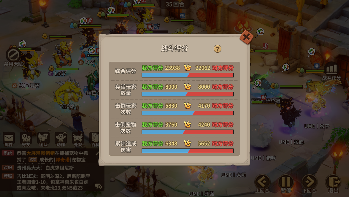 本场比赛可以说是相当精彩,阿翠战队在开局击飞朱雀和合击攻人出火拔得头筹情况下,Ume战队稳住局面保持发挥,战斗中盘通过敏段优势一直压制阿翠战队输出开始拿分;而阿翠战队的表现也是可圈可点,即便没法拿人头分的情况下依旧通过拿宠物分保持分数差距不大,为战斗收盘的几回合把比分拉近提供了基础,阿翠战队的击倒宠物分在战斗中盘阶段是一直保持领先的。