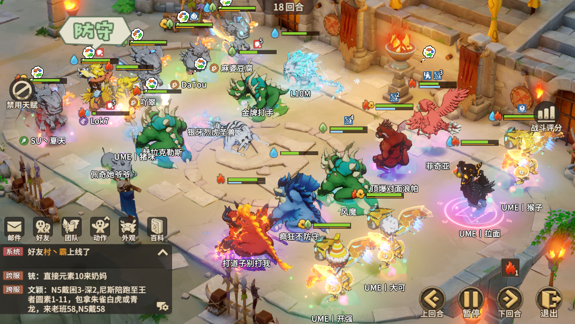 由于阿翠战队的夏天没法提速到拉面前面出手,第4回合夏天更换金飞坐骑降速,却在后续战斗中持续被Ume的开强给硬控,逼着把驱散猪召唤出来。经过几回合的调整双方的配速都有一定的改变,但是Ume战队猴子配速依旧是卡在阿翠战队豆腐后面,既可控前杀后,又可以控爪攻去杀其他单位,还能卡住豆腐的场地,简直让阿翠战队不要太难受,在第18回合还出现了5个单位被石化,1个单位被睡的情况,Lok7只能防御保存活,从这里开始朱雀已经是好几回合保持4层火魔buff的状态,只要一出手打攻人就是1200+的伤害。