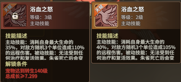 (1)由于朱雀的天赋技能浴血之怒会消耗自身最大生命,所以并不是无脑使用就可以,正常情况下朱雀是不具备单杀攻人的条件,即便是两三只朱雀一起也不一定能击杀,所以如果要击杀对方攻人,可以己方攻人能配合输出的时候进行补刀,或者和虎弓进行搭配输出,而在对战中更多情况下朱雀应该是针对前排攻宠进行压制,无论是连续攻击、背水或者浴血都是可以的。