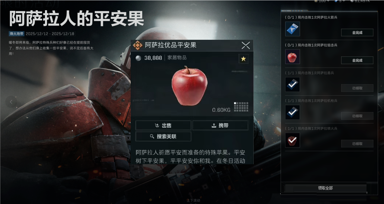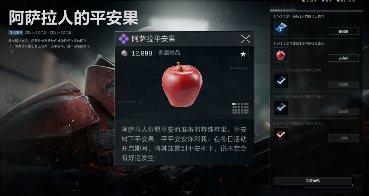 首先必须强调:本次活动的核心道具是 “阿萨拉平安果”,而非游戏内的普通 “苹果”!如果有玩家误以为普通苹果能参与活动,甚至囤了一仓库,这可就白忙活了。