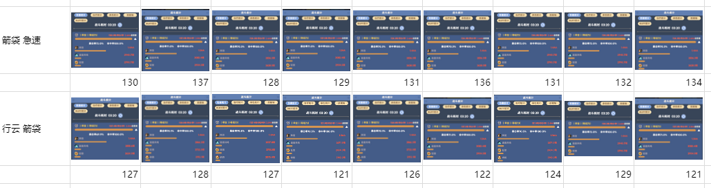箭袋+极速在30次测试中平均高于传统 行云加箭袋5%-10% ,和伤害公式计算结果符合。