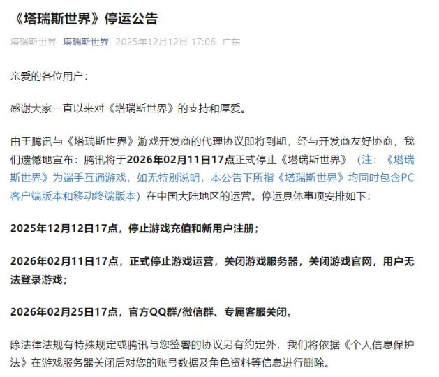 继11月14日国际服正式关服后,腾讯代理的跨端MMORPG《塔瑞斯世界》今日发布停运公告,宣布国服将于2026年2月11日17点正式终止运营。这款曾以“硬核开荒 + 公平竞技” 为核心卖点、被玩家寄予厚望的游戏,自上线以来仅运营一年半便迎来谢幕。