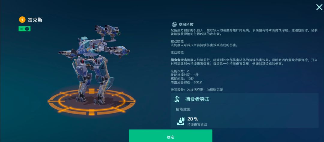 [雷克斯] 是版本少有的四专技机甲,在专技选择上,除了进攻、防御拥有近战者、破坏者两条特殊路线,既能让指挥官自定义机甲定位,还能解锁更多永久属性词条,基础属性优势显著。