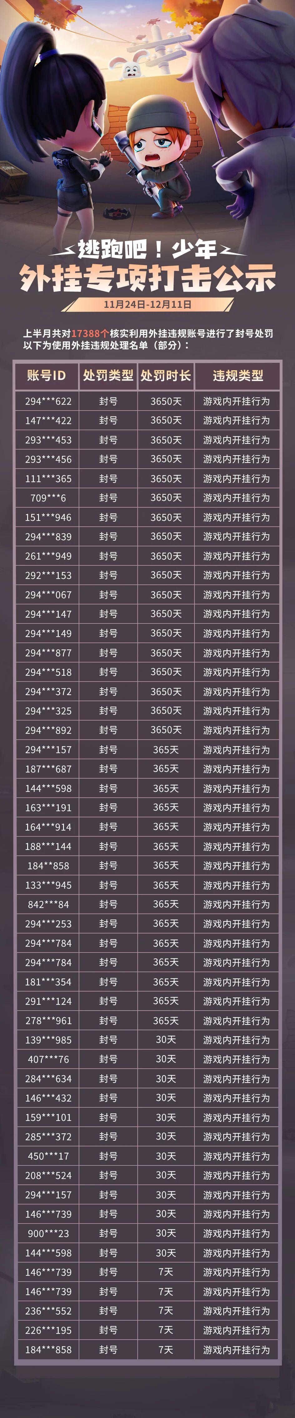 游戏安全处罚公示(11月24日——12月11日)