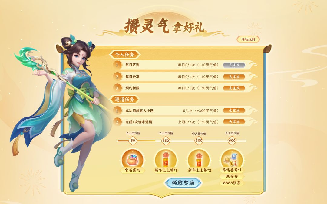滴滴~快上车!在活动页面中,邀请好友组成五人小队,小队成员均可获得灵气值。少侠可以通过完成活动任务,不断积攒灵气。灵气值达到对应目标即可获得金券、银票等奖励,四档奖励可叠加。具体规则请前往活动页面查看。