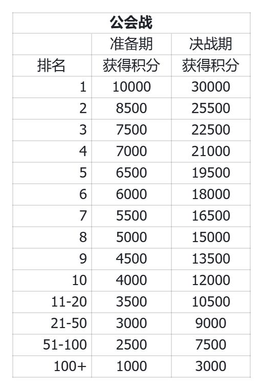 决战期排名:依据公会在三战场个人分数榜中前20的得分总和进行排名。