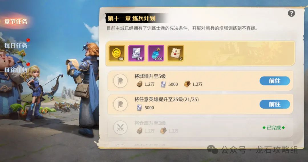 2.按照主线任务推进章节。快速推进到15-18章节。此处会遇到资源卡点,遇到就推进远征和烽火章节,以及开启资源秘境等。