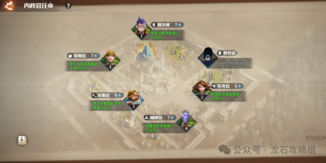 1.记得内政官解锁第一时间上任并升级(优先点城建官等级速堡),并且按照图直接点,教导官(点额外龙鳞)