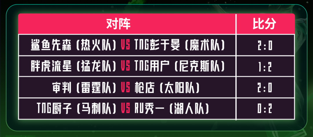 TNG用户以2比1战胜胖虎流星,首局猛龙队凭借斯科蒂.巴恩斯4中3的三分球,29比24取得胜利。第二局,尼克斯队整体手感回暖,唐斯和布伦森合砍20分,猛龙队巴恩斯无法延续第一局的准度仅得到4分,尼克斯以31比17获得胜利。第三局,前三节十分焦灼,猛龙领先三分进入第四节,凭借唐斯的内线进攻比赛剩下1分钟反超比分,最终以31比28战胜猛龙队,TNG用户晋级四强。