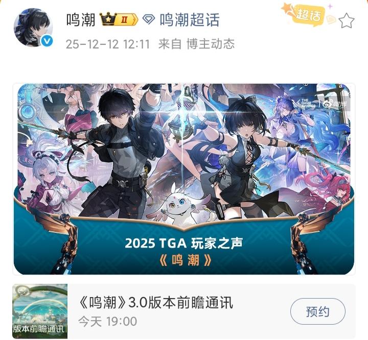 12月12号,TGA分猪肉典礼正式落幕,《鸣潮》则是拿下了【2025 TGA 玩家之声】奖项🎉🎉🎉