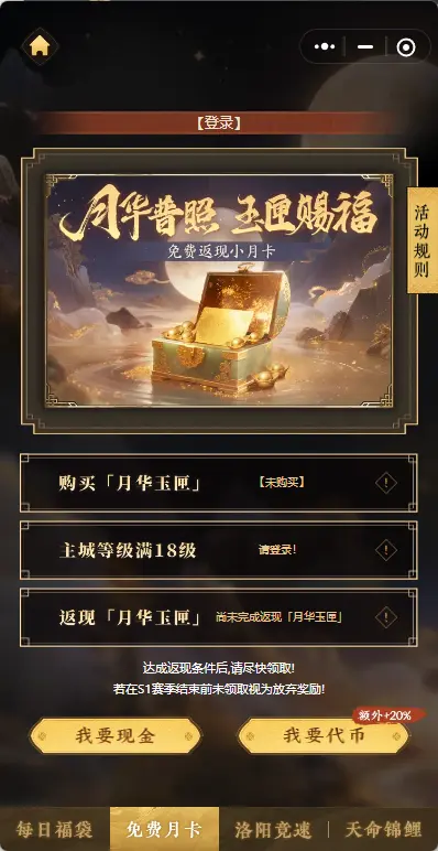 购买S1赛季「月华玉匣」月卡,赛季结束前主城等级达18级,即可享受充值金额全额返还!还可选择120%等值游戏代币返还,可在游戏内购买礼包、道具等,代币当钱花,买啥都自在~