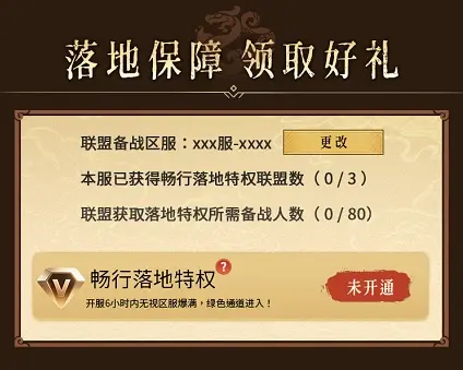 在打金服快人一步的秘诀就是:提前备战打金服!组建或加入备战盟,可提前集结力量,商量落州策略,获取"畅行落州特权":允许成员在开服6小时内无视服务器爆满状态,正常进入!