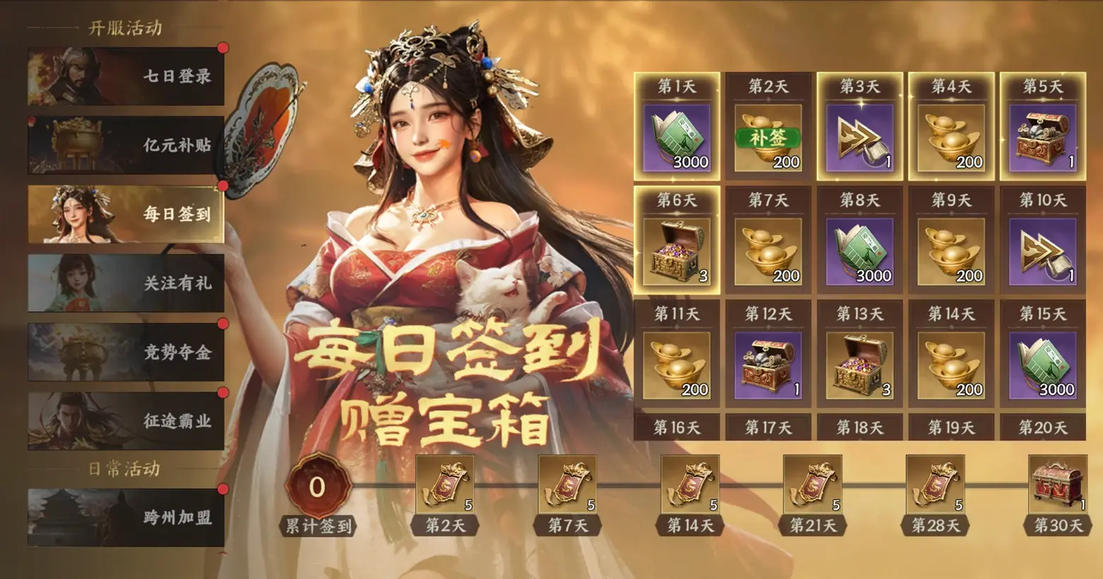 ●每日签到:元宝*3000、聚义今*25、核心武将自选宝箱*1