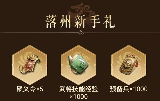 还有落州新手礼:聚义令、武将技能经验、预备兵等你来领!