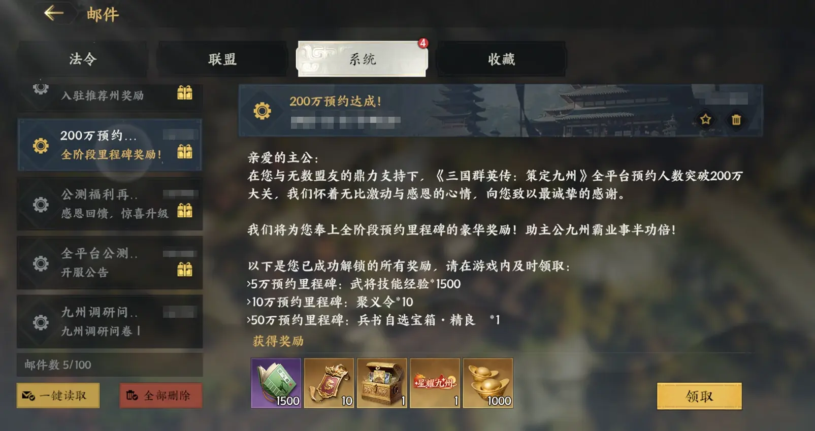 ●200万预约里程碑福利:武将技能经验*1500、聚义令*10、兵书自选宝箱精良*1、星耀九州称谓、元宝*1000