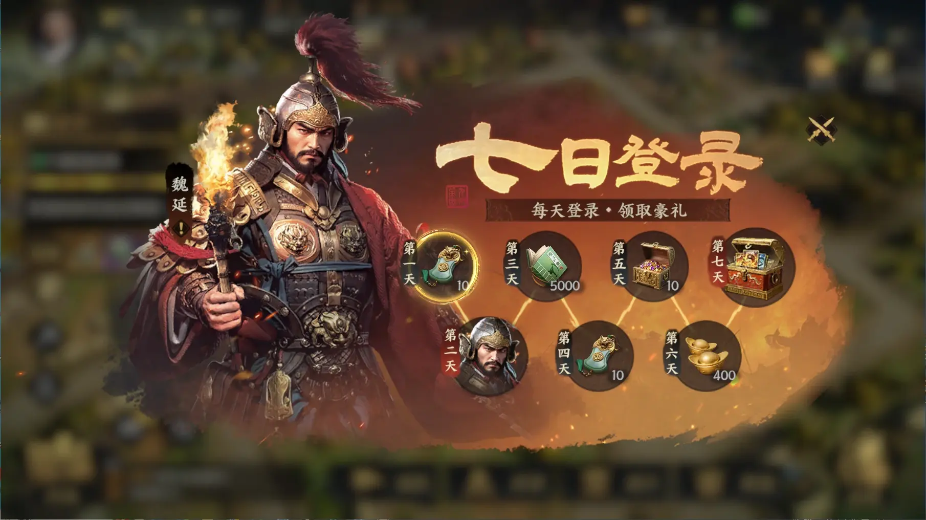 ●七日登录:元宝*400、募杰今*20、武将魏延、兵书自选宝箱精良*1