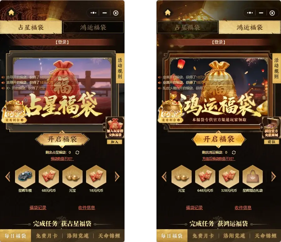 每日完成登录游戏、任意充值等任务即可获得福袋抽奖机会,海量游戏资源道具、最高648代币、星辉车模、星辉周边礼袋等奖励等你来赢!天天都有新惊喜!