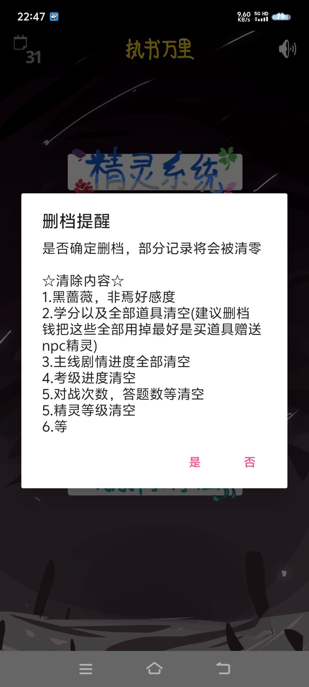 删之前最好不要把道具给黑蔷薇和非焉!因为游戏设定,他俩好感度会因为删档而被清空,其他角色不会