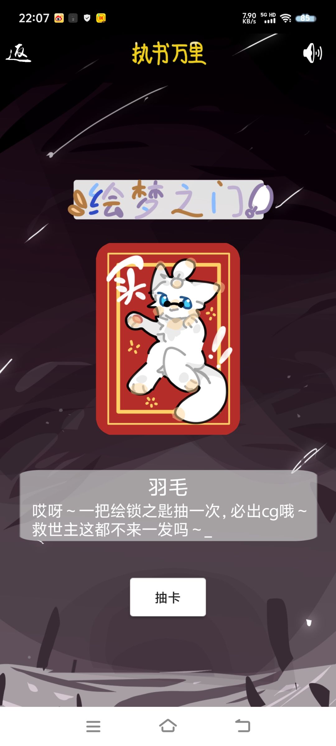 需要使用道具『绘锁之匙』抽取,这个通常更新,签到,抽卡都可以获得,但数量都很少(因为绘梦更新的卡图少,因此限制了获得数量)