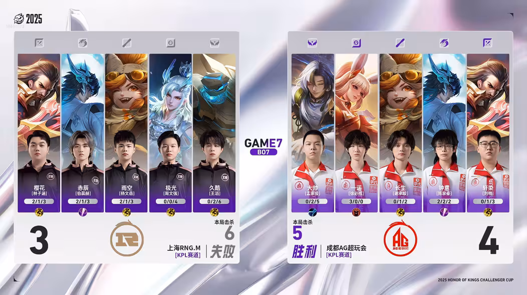 蓝色方(成都AG超玩会):关羽、橘右京、安琪拉、虞姬、空空儿