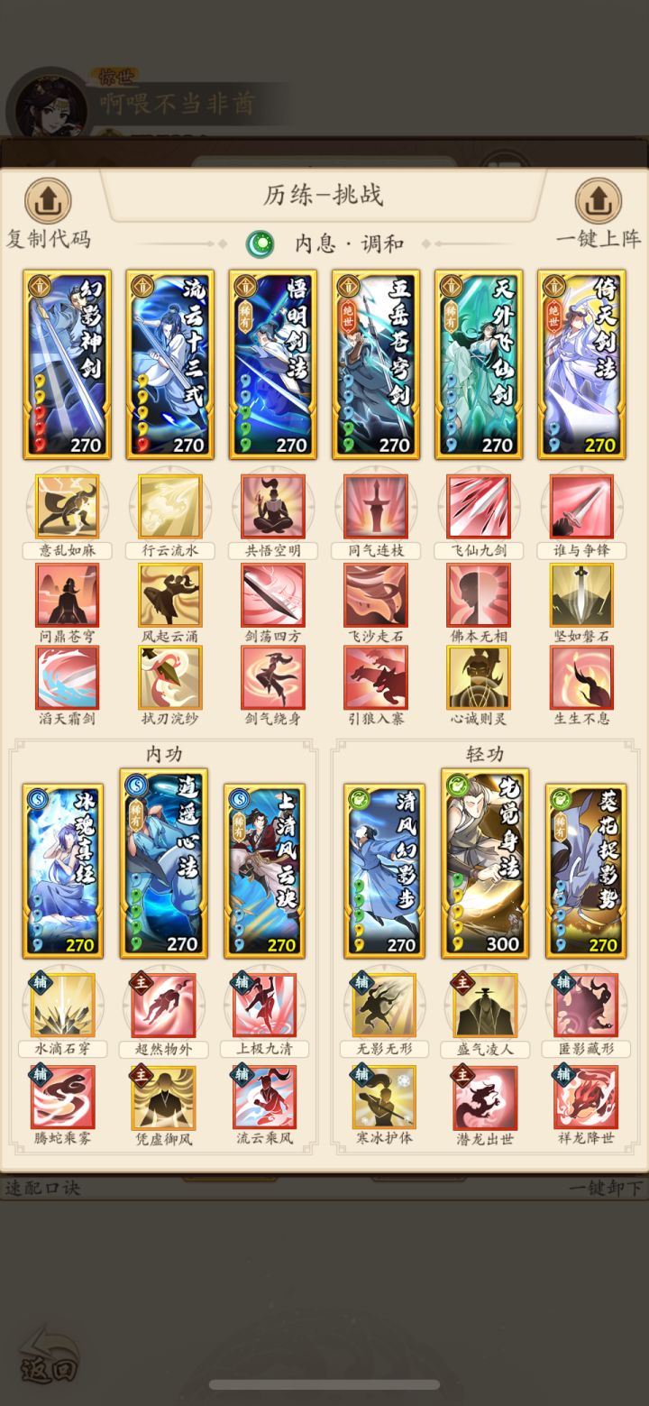 。内轻方面。内功主逍遥,上清很好,但就上极九清而言,副运运功触发几率不变,楼主还是考虑副了。轻功主先觉,等影月,副葵花是为了凑流血、盲目,亏一点聚气,但如果歪打正着刀系大杀器绣春,那就血赚。另外的关键是主一手潜龙,防一手气海的散功,主要现阶段还是比较仰仗流云的解控的。其他的招式能凑运功就凑运功,遂带上祥龙降世,也可以加容错不是