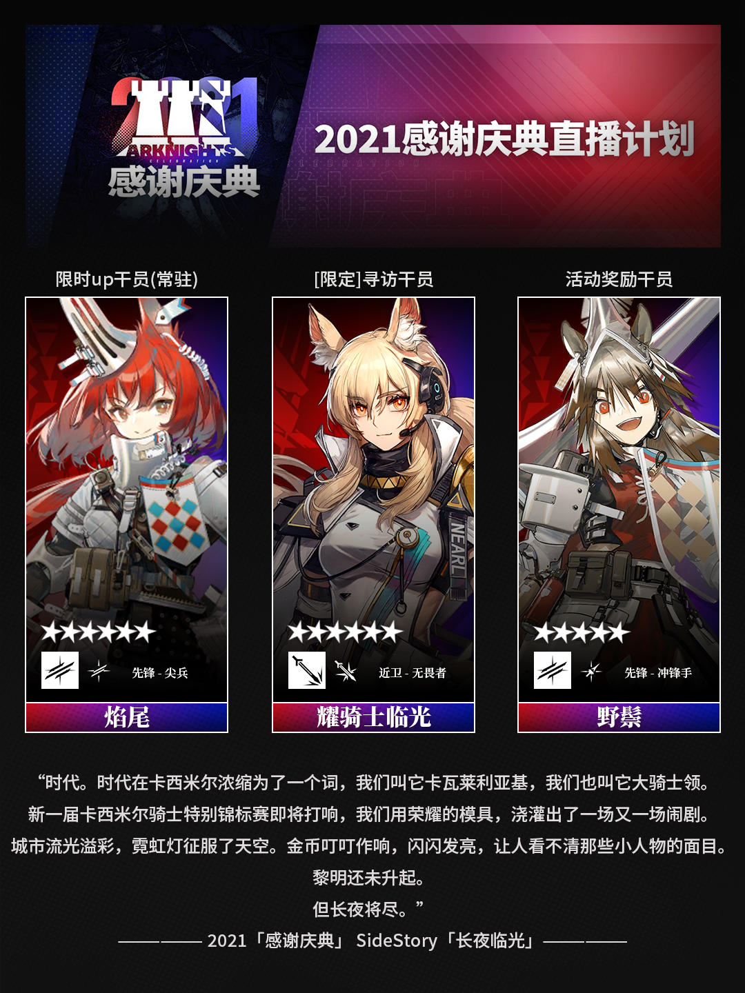 游戏《明日方舟》介绍❗2021「感谢庆典」 的相关背景文案,提到卡西米尔骑士特别锦标赛等❗信息。干员分类及展示。其技能往往具备一定的防御强化与群体保护能力,在战斗中可以凭借法术输出对敌方造成可观伤害,是游戏中具有战略意义的干员之一。