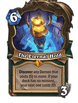 - 新:发现任意一张法力值消耗大于或等于(5)点的恶魔牌。如果你的牌库中没有随从牌,你的下一张随从牌法力值消耗为(0)点。