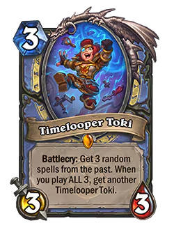 - 新:[3费3/3] 战吼:随机获取3张来自过去的法术牌。当你使用了全部3张法术牌,再获取一张时光循环者托奇。