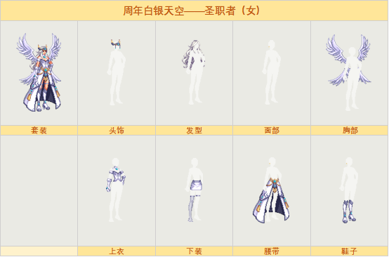 套装整体看,银白主调搭配羽翼与铠甲裙装,既完美契合女圣职者的神圣职业特质,又通过利落版型衬出飒爽气场,整套造型华丽且层次感十足,精致装饰与大气轮廓让角色既有神职者的庄严感。