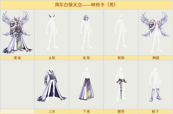 套装穿戴下,银白主色调的长款衣袍,搭配上非常华丽的肩部翅膀与装饰,既保留了天空套的神圣华丽感,又衬托出男神枪手的潇洒气场,整套造型精致且兼具飘逸与利落,完美契合职业的帅气特质。