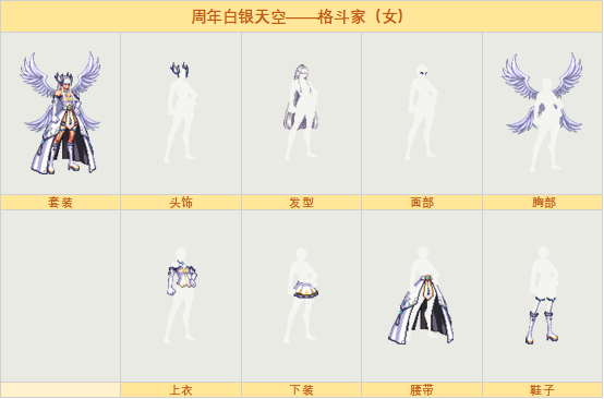 整体看,套装效果既调衬出女格斗家干练身形,又通过银白主色系的羽翼元素 + 铠甲裙装的组合,保留了天空套的神圣华丽感,同时展现了女格斗家力量与灵动兼具的职业气质,套装造型精致、气场鲜明。